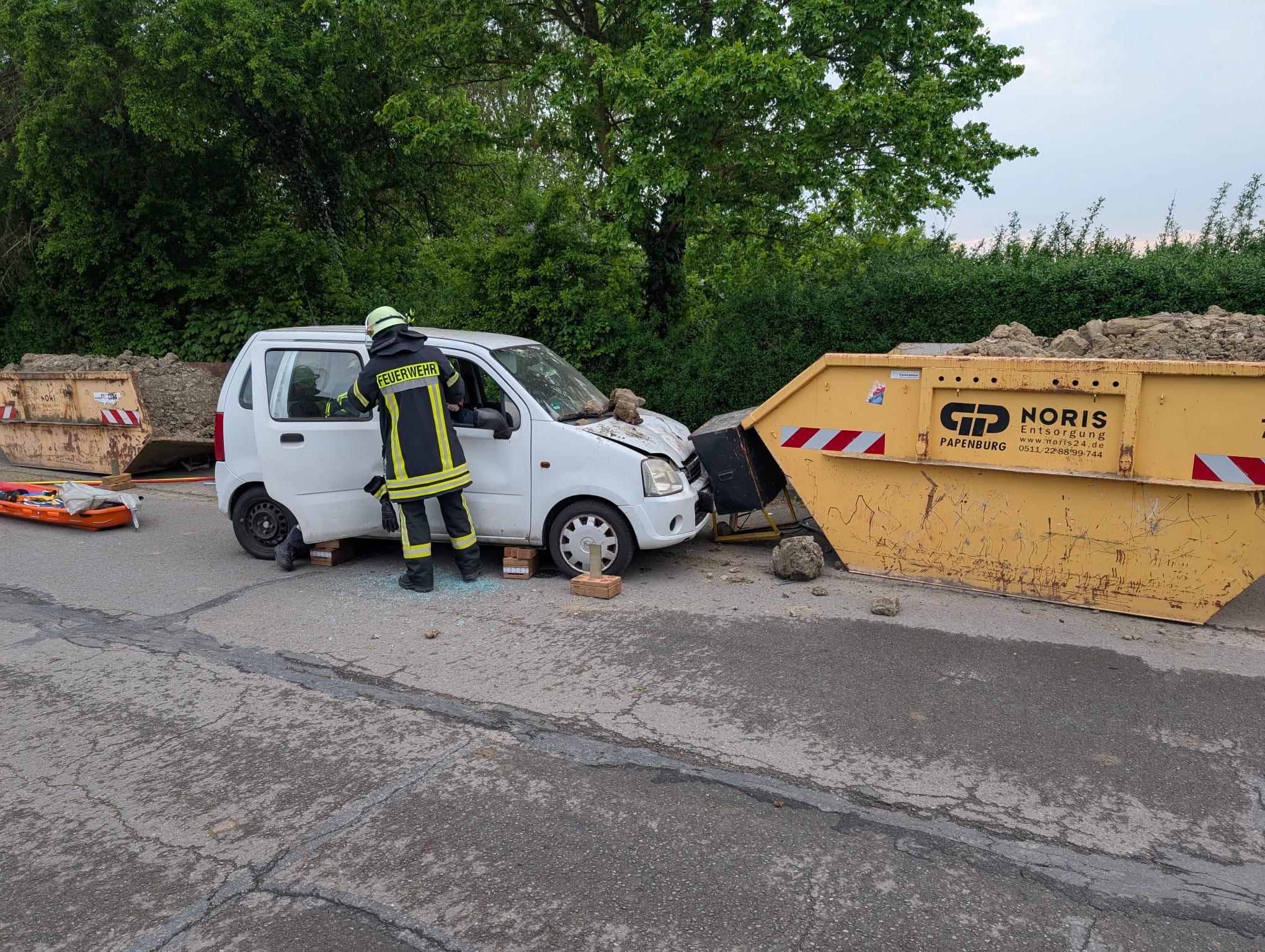 Am Abend des 2. Mai wurde die Freiwillige Feuerwehr Mehrum zu einem Verkehrsunfall in den Friedhofsweg alarmiert. Das Einsatzstichwort lautete „VU 1 – Verkehrsunfall mit zwei verletzten Personen“. Vor Ort stellte sich folgende Lage dar: Ein Pkw war mit hoher Geschwindigkeit gegen einen Bauschuttcontainer und einen dazwischen stehenden Baustromverteiler geprallt. Im Fahrzeug befanden sich zwei Personen – ein Mann und eine schwangere Frau – beide waren im Fahrzeug eingeschlossen.