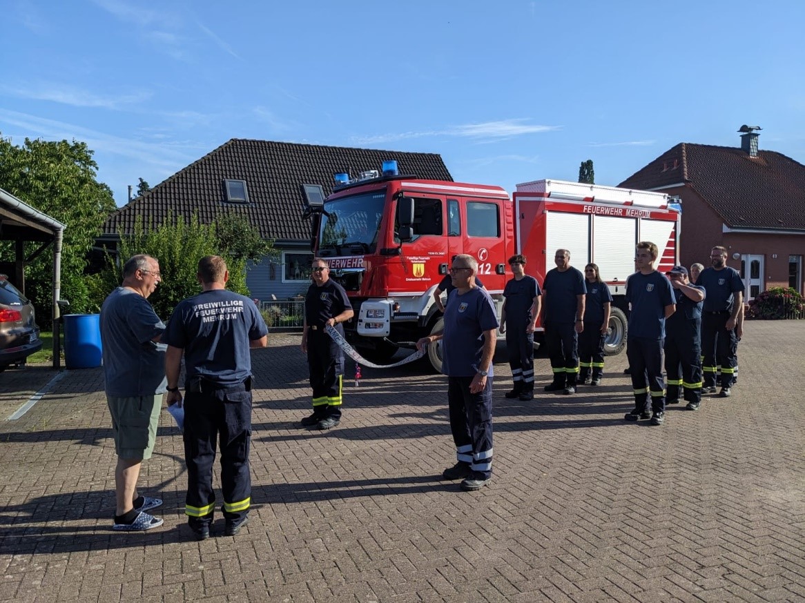 Am Dienstag, den 30.07.2024 verabschiedeten die Kameraden und Kameradinnen der Freiwilligen Feuerwehr Mehrum ihren Kameraden Reinhard Brathering, der an diesem Tag seinen 67. Geburtstag feierte. Um Reinhard für seine 50 Jahre in der Einsatzabteilung zu danken, wurde er zu Hause durch das Martinhorn und das Blaulicht von den Kameraden überrascht.