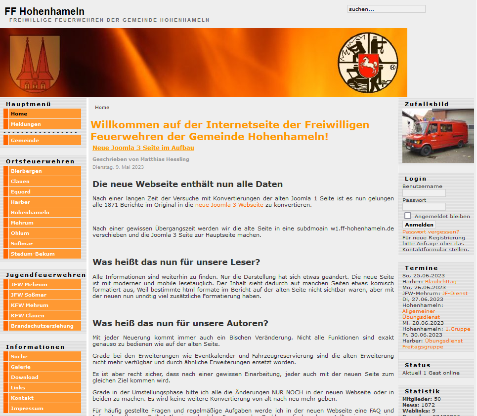 Sollte Interesse bestehen Inhalte auf der alten Seite zu prüfen, so ist das nachwievor möglich. Die Seite wurde in die subdomain w1.ff-hohenhameln.de verschoben.